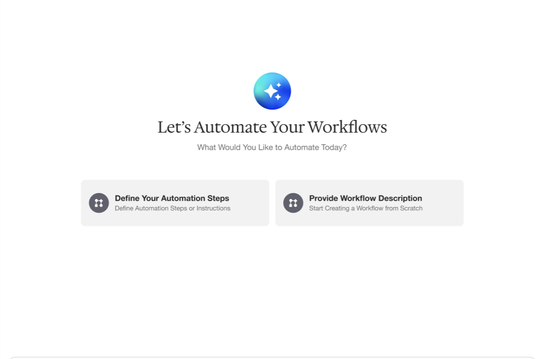 Break down your workflow into clear, actionable steps in plain language. Describe what you want to automate and how each stage should work. Run workflows with AI at scale and connect your systems to build your knowledge base.